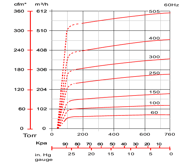| Hz | Vacuum Hg" | Vacuum KPA | Vacuum CFM |